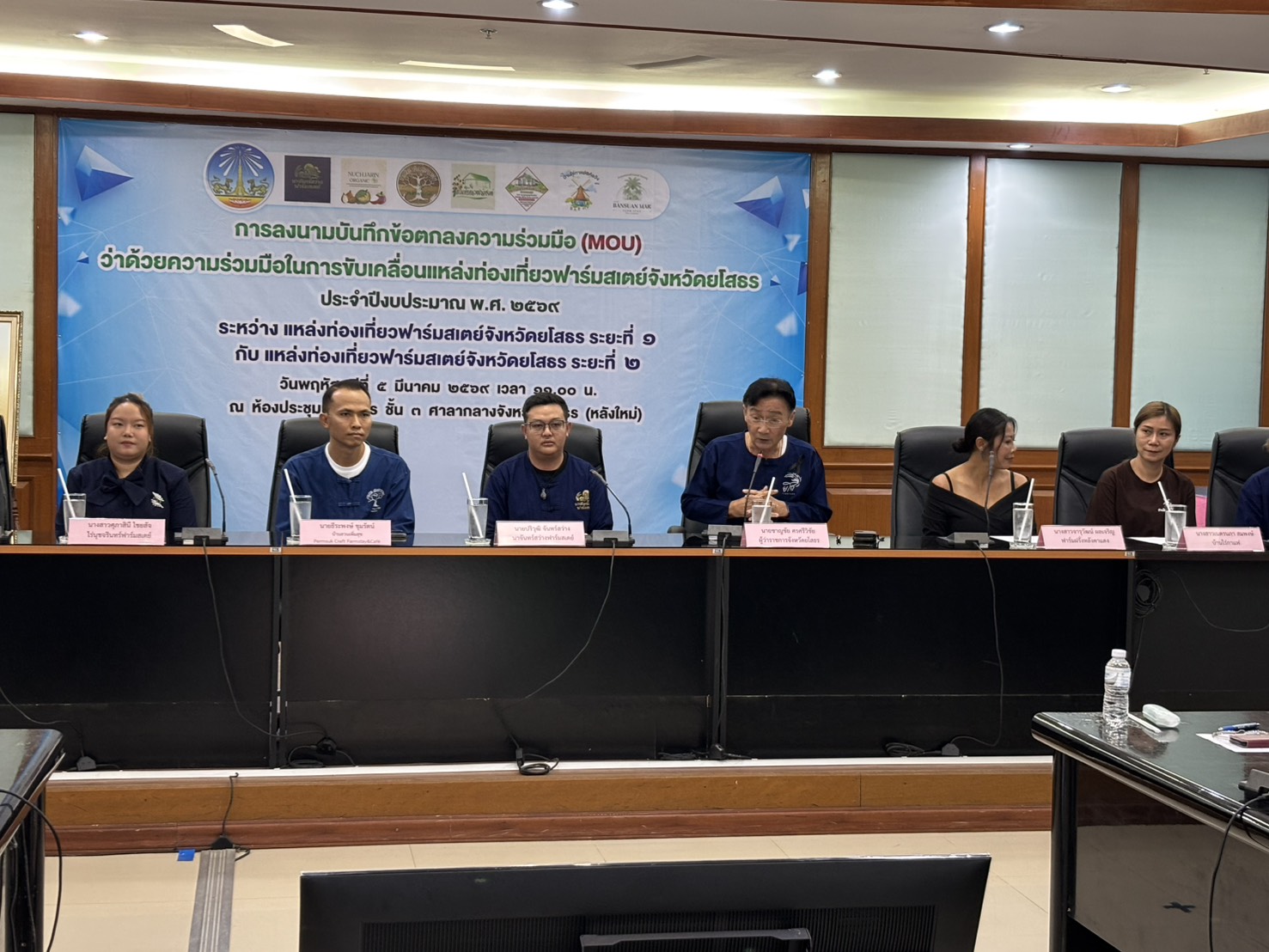 วันพฤหัสบดีที่ 5 มีนาคม 2569 เวลา 11.00 น. นางสาวสุเนตร เทพมังกร อุตสาหกรรมจังหวัดยโสธร เข้าร่วมเป็นสักขีพยานในการลงนามบันทึกข้อตกลง ความร่วมมือ MOUว่าด้วยความร่วมมือในการขับเคลื่อนแหล่งท่องเที่ยวฟาร์มสเตย์จังหวัดยโสธรประจำปีงบประมาณ พ.ศ. 2569 ณ ห้องประชุมยศสุนทร ชั้น 3 ศาลากลางจังหวัด โดยมีนายชาญชัย ศรศรีวิชัย ผู้ว่าราชการจังหวัดยโสธร เป็นประธานการประชุมฯ